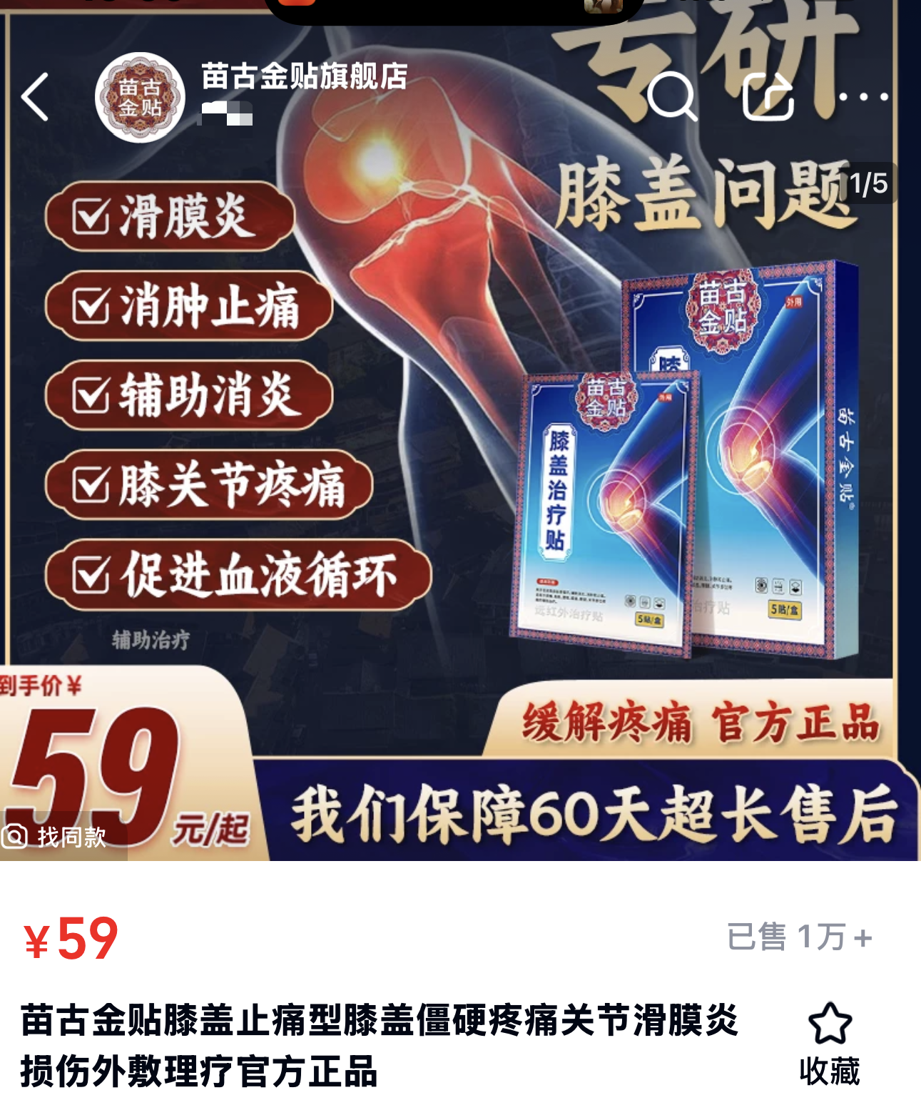 调查还发现,上述3家电商相关网店宣传页面存在诸多违规内容:销售“苗古金贴远红外治疗贴(颈椎型)”时宣传“专攻颈椎问题、一贴改善”等内容,销售“膝盖止痛型”产品时宣称适用于“滑膜炎、膝盖肿胀、膝关节炎、膝盖疼痛、半月板损伤、膝关节积液、哪痛贴哪、快速止痛”;销售“肩周止痛型”时宣称“专攻肩周问题、肩周炎、肩袖损伤肩颈僵硬、酸麻疼痛、肩胛骨缝疼、头晕恶心”等,上述宣传内容与产品批准的适合使用的范围并不符。部分产品标注“中老年专用”,并在详情页多次使用老年人形象进行宣传。